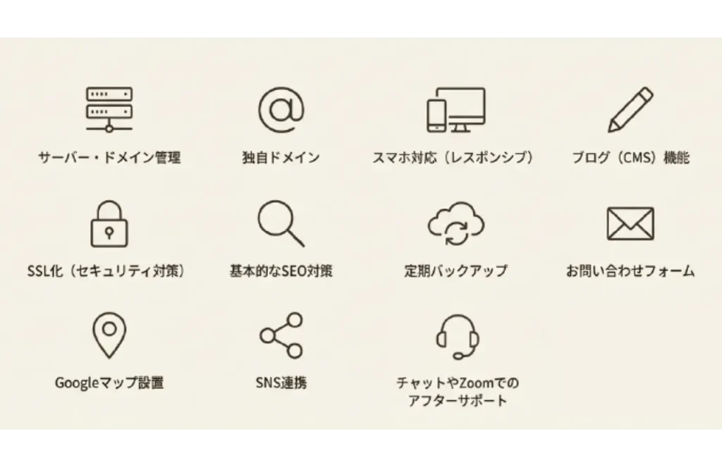 サーバーやドメインの取得・管理、SSL(セキュリティ対策)、スマホ対応、定期バックアップまで、専門知識が必要な作業はすべて月額料金に含まれています。パソコン操作に自信がなくても、プロが裏側をしっかり支えるので、あなたは安心して自分にしかできない仕事に専念できます
